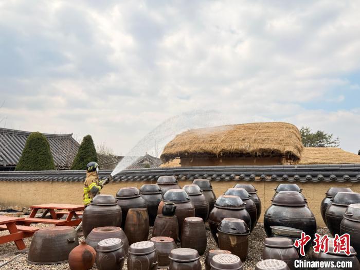當(dāng)?shù)貢r(shí)間3月28日,消防員在韓國“河回村”進(jìn)行噴水作業(yè)?!≈行律缬浾?劉旭 攝