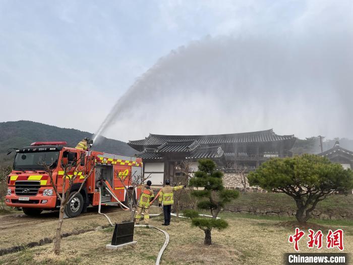 當(dāng)?shù)貢r(shí)間3月28日,消防員在韓國屏山書院進(jìn)行噴水作業(yè)?!≈行律缬浾?劉旭 攝