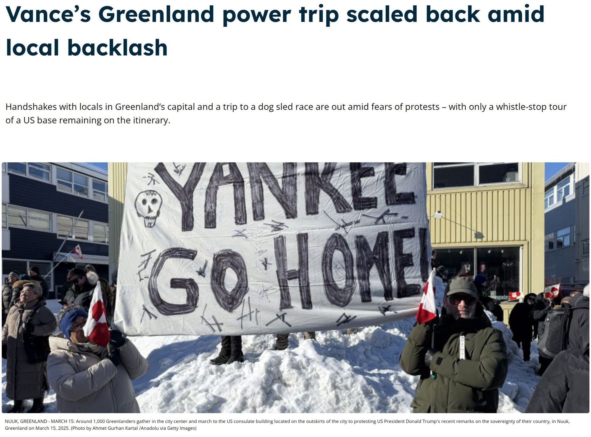 迫于輿論壓力,萬斯的夫人烏莎·萬斯此行不得不取消了去格陵蘭島首府努克和第二大城市錫西米尤特參加相關(guān)文化活動的計劃。