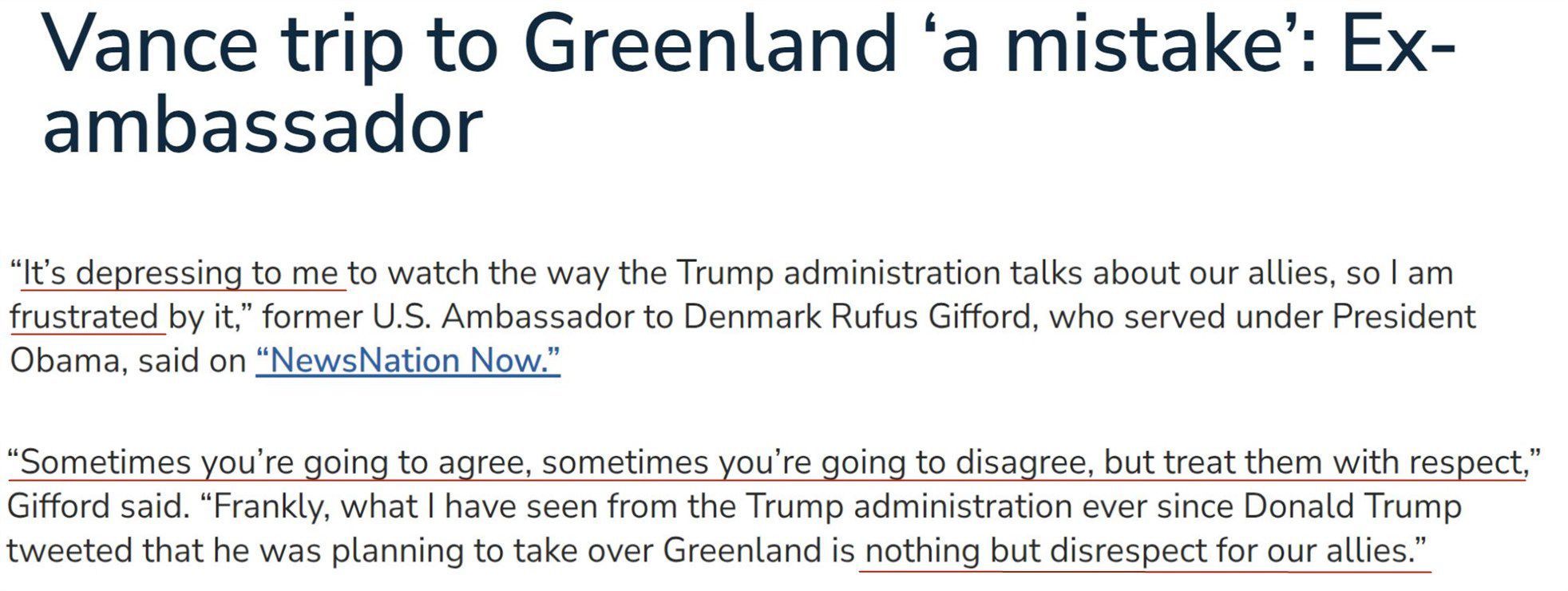 美國前駐丹麥大使吉福德近日在接受采訪時也認為,美國政府在格陵蘭島問題上缺乏最起碼的尊重。