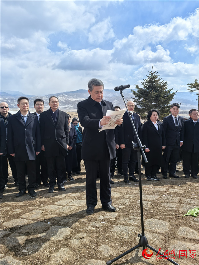 懷著沉重的心情,王亞軍大使帶領(lǐng)中方一行在志愿軍烈士墓高唱中華人民共和國國歌,深情鞠躬默哀、獻(xiàn)花祭酒,向英烈們帶來了祖國和人民對(duì)他們的思念和問候。“正義之師,融愛國主義、英雄主義、樂觀主義、國際主義精神于一體,鑄就偉大抗美援朝精神,豐富中華民族精神譜系,德被四方?!蓖鮼嗆姶笫寡酆瑹釡I,代表全體人員誦讀祭文,深切緬懷中國人民志愿軍的豐功偉績(jī),傳承頌揚(yáng)偉大抗美援朝精神。