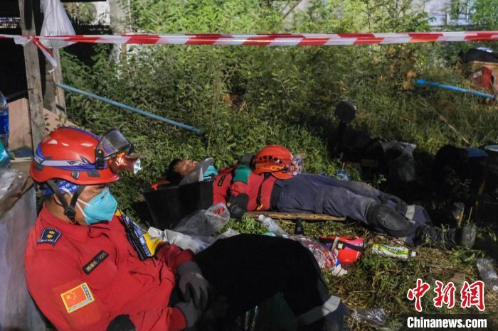 夜色愈加深重,天氣悶熱依舊,各救援隊(duì)顧不上吃晚飯,輪番上陣,救援人員無(wú)一不渾身濕透。輪換期間,有救援人員和衣而臥,躺在草坪上休息。