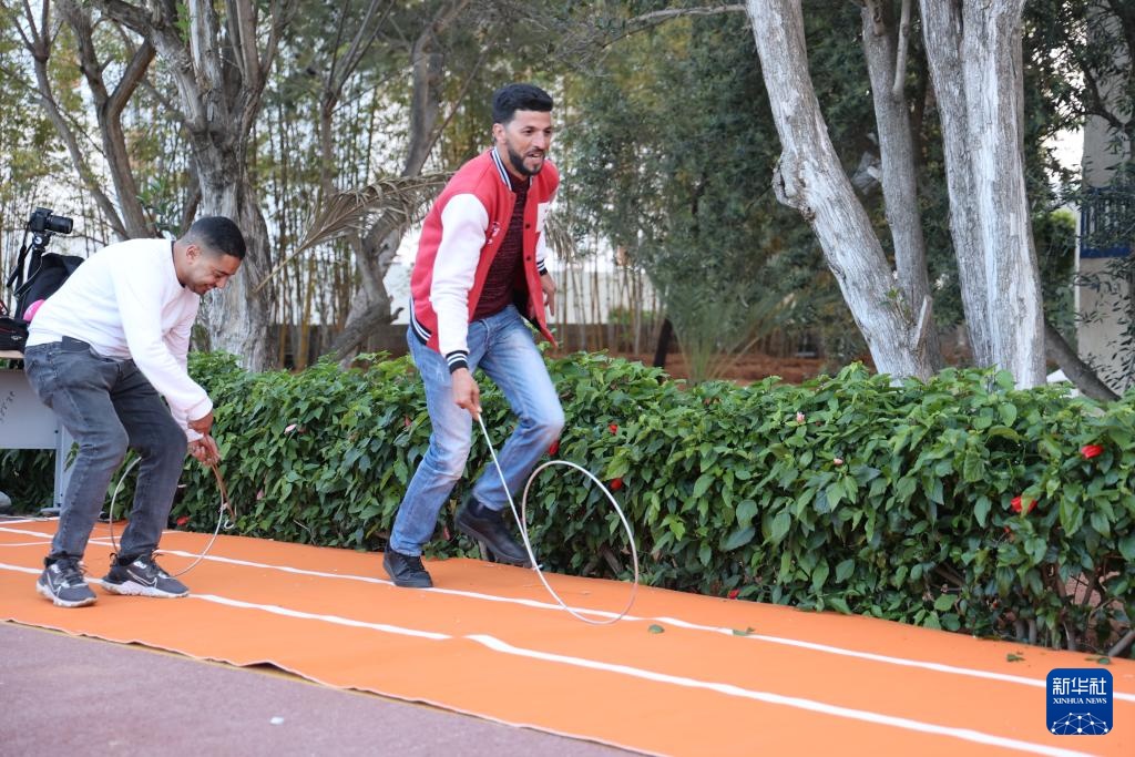 4月3日,在摩洛哥首都拉巴特的國立拉巴特高等礦業(yè)學(xué)校,兩名男子在“世界文化周”活動(dòng)的中國展臺(tái)體驗(yàn)滾鐵環(huán)。新華社記者 霍晶 攝