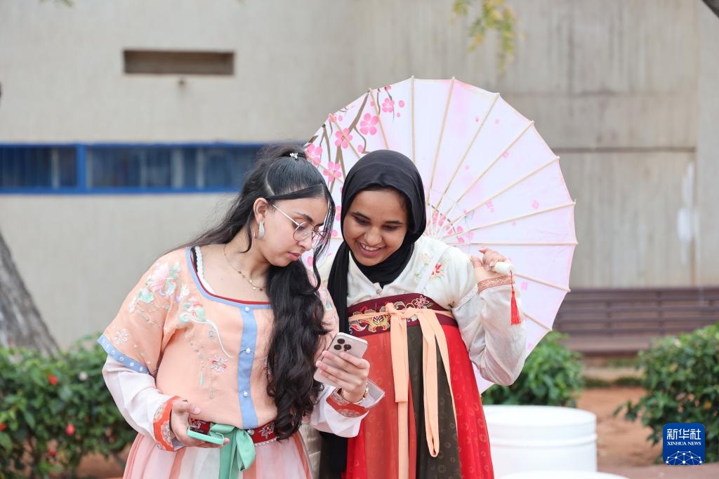 4月3日,在摩洛哥首都拉巴特的國立拉巴特高等礦業(yè)學(xué)校,兩名女孩在“世界文化周”活動(dòng)的中國展臺(tái)體驗(yàn)漢服。新華社記者 霍晶 攝