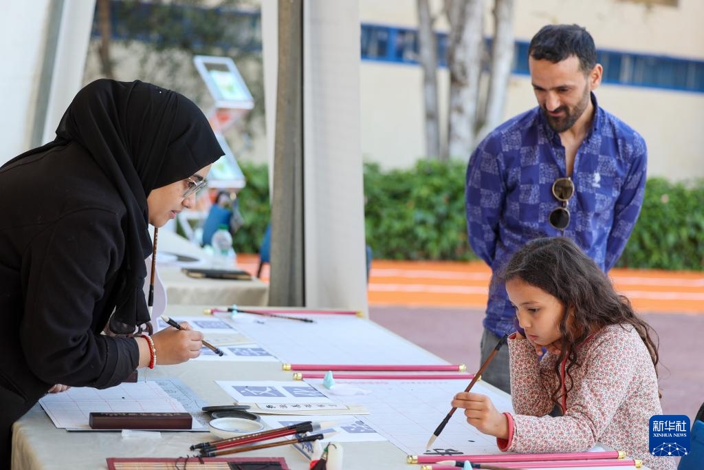 4月3日,在摩洛哥首都拉巴特的國立拉巴特高等礦業(yè)學(xué)校,一名女孩在“世界文化周”活動(dòng)的中國展臺(tái)體驗(yàn)中國書法。新華社記者 霍晶 攝