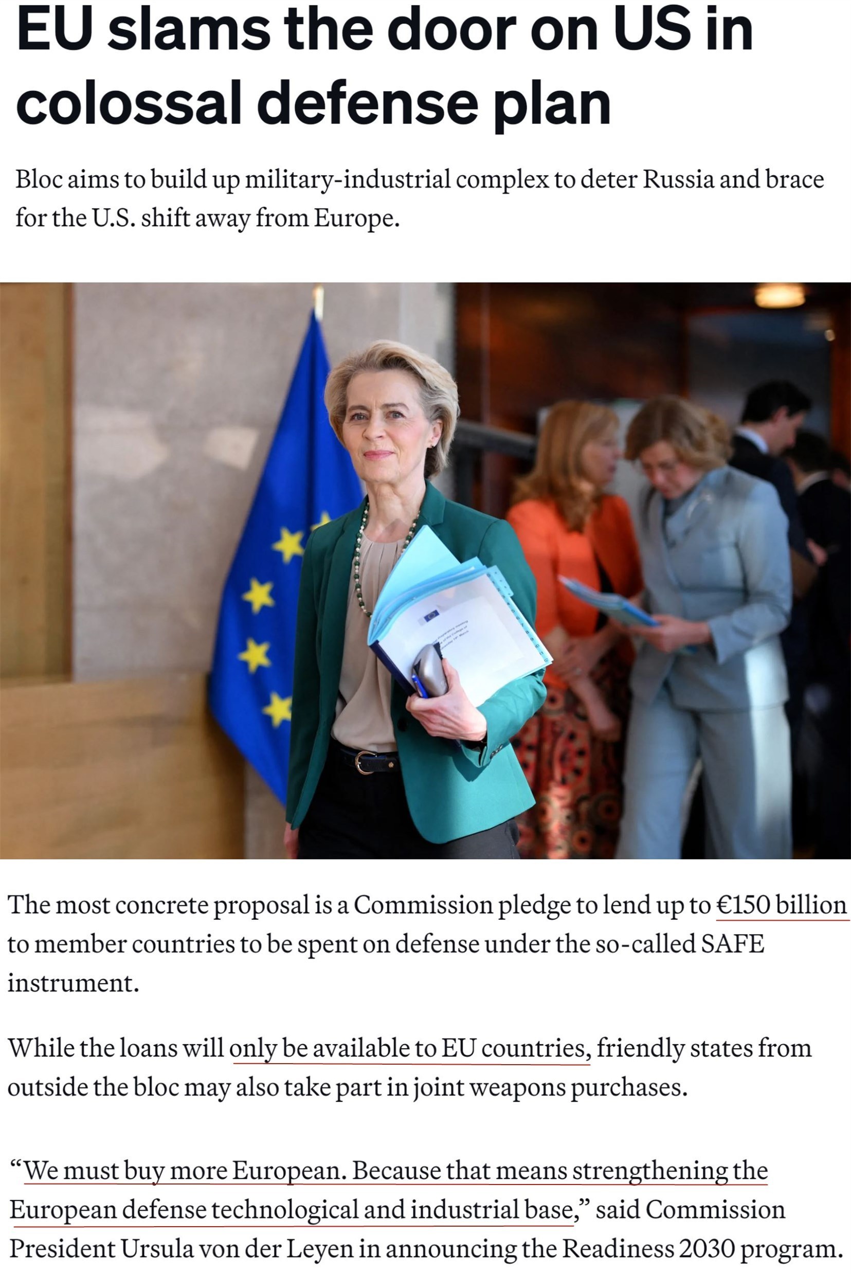 據(jù)報(bào)道,美國的軍火商被排除在1500億歐元貸款軍費(fèi)采購計(jì)劃外。