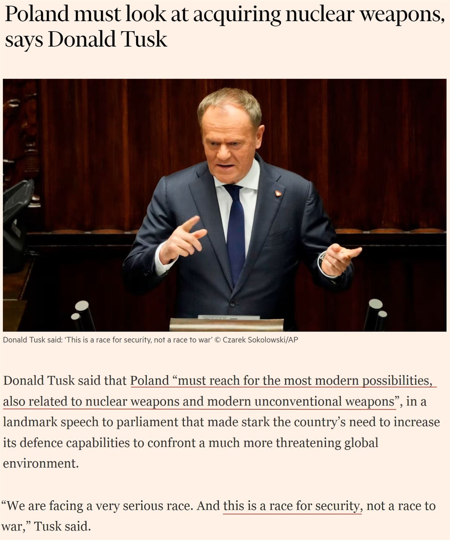 “我們必須意識(shí)到,波蘭必須爭取包括與核武器以及非常規(guī)武器相關(guān)的最現(xiàn)代化的能力。因?yàn)?,這是一場(chǎng)爭取安全的競(jìng)賽?!?/p>