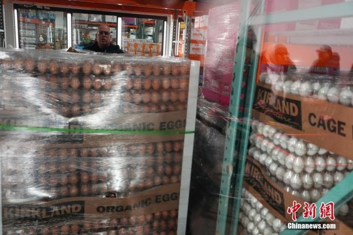 受禽流感影響,近期美國(guó)各地雞蛋供貨緊張,價(jià)格飛漲。圖為超市工作人員運(yùn)送雞蛋。中新社記者 廖攀 攝
