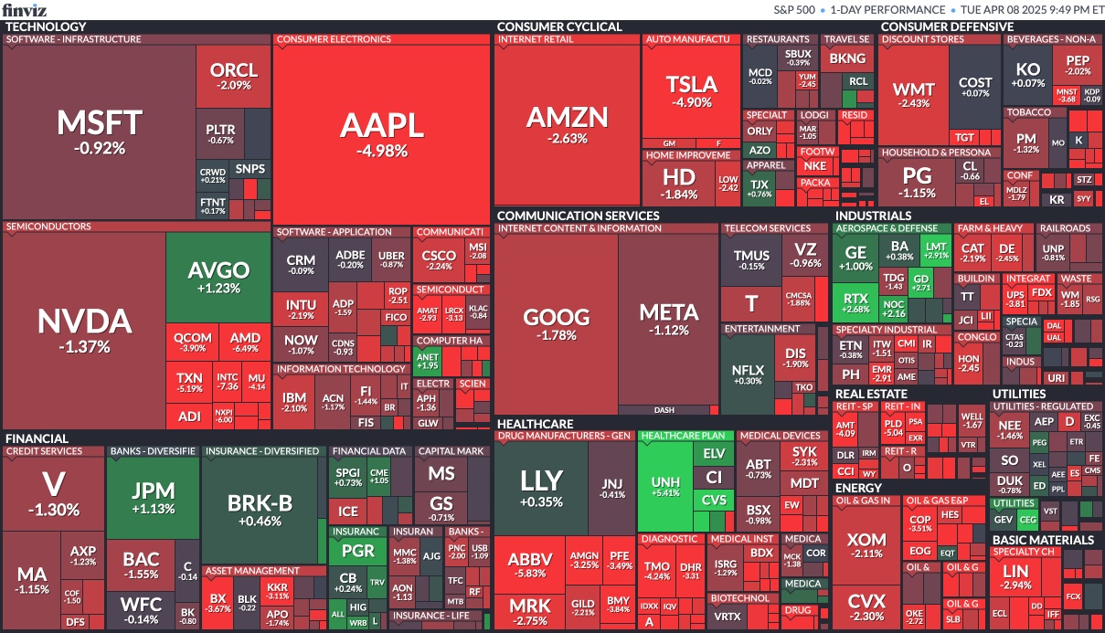 既然是黑手黨做派,白宮自然不會考慮市場會怎么想。4月8日,美國三大股指均經(jīng)歷了從暴漲到暴跌的劇烈震蕩。標普 500 指數(shù)和納斯達克指數(shù)當天震蕩幅度都超過了6%。