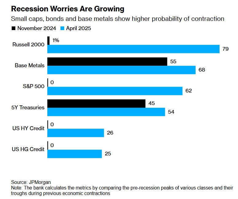 美國最大投行摩根大通4月8日表示,以小型股為主的羅素2000指數(shù)在近期的大跌中受到重創(chuàng)。該指數(shù)目前認為經(jīng)濟衰退的可能性為79%。而在去年11月份,美國大選剛剛塵埃落定之時,這一指數(shù)預測的衰退可能性只有1%。