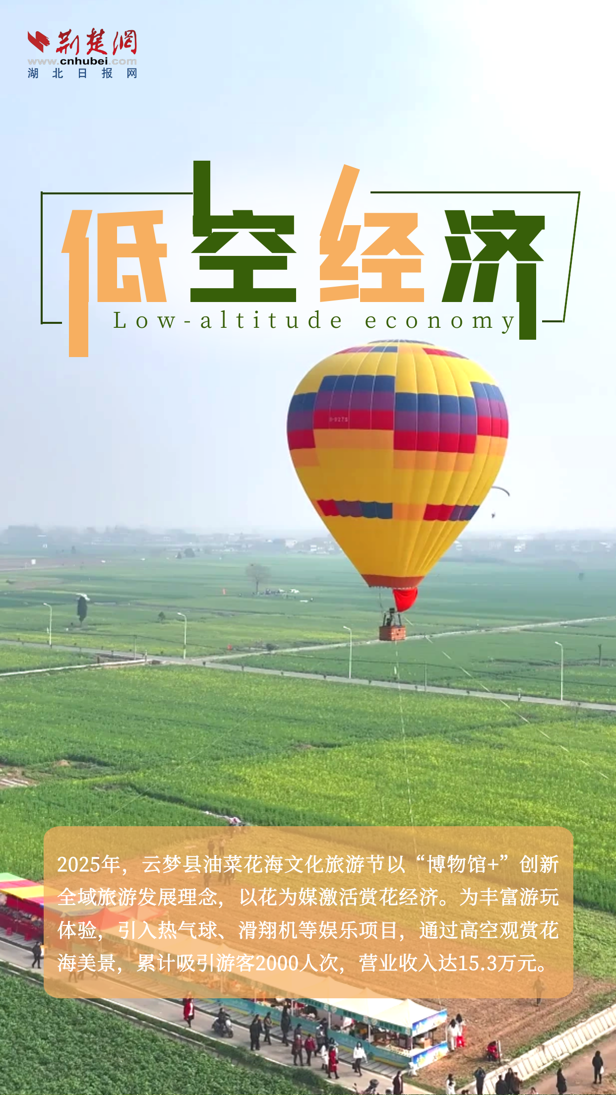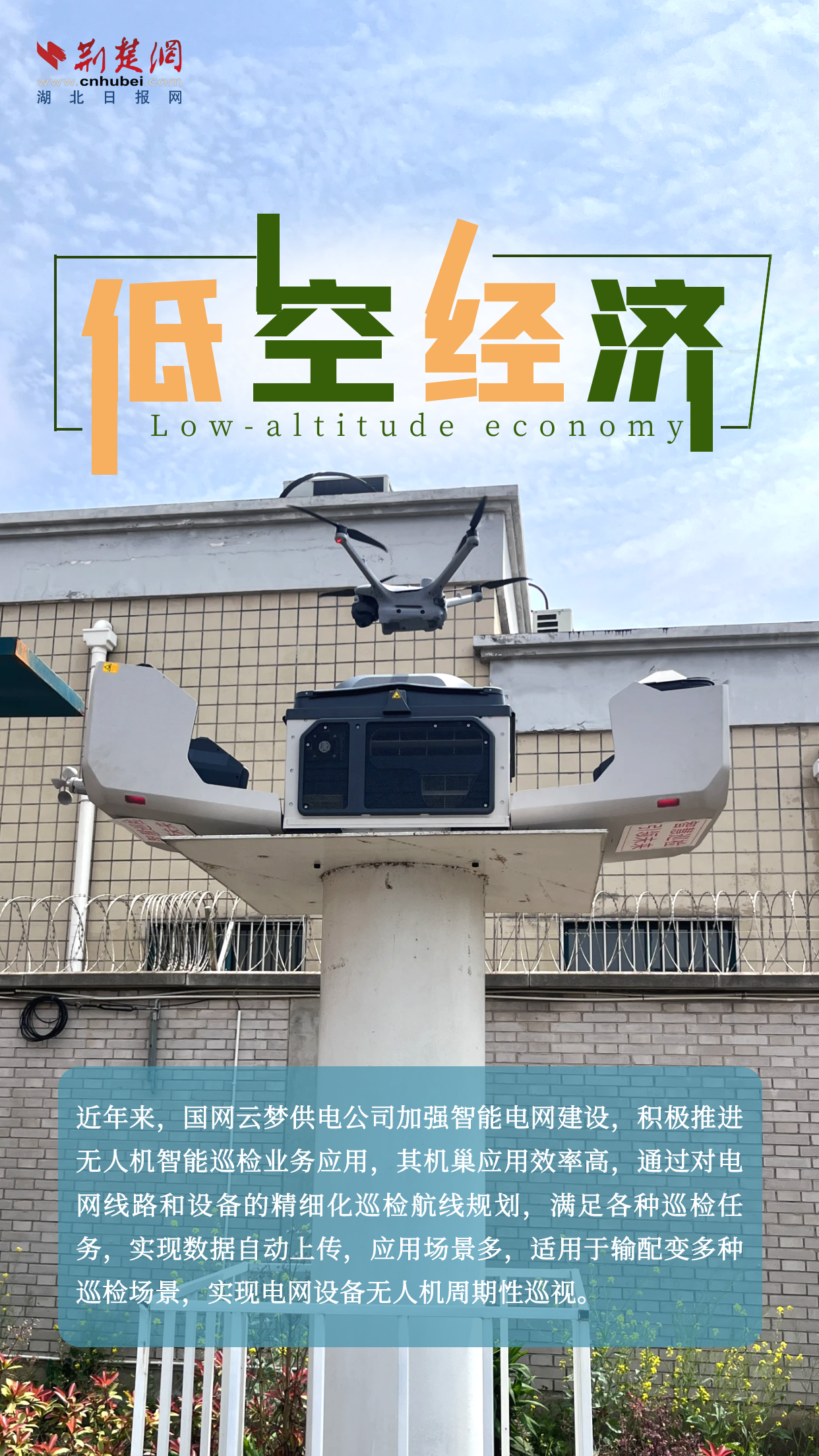 荊楚網(wǎng)(湖北日?qǐng)?bào)網(wǎng))訊(記者楊卓玉 通訊員聶杰杰)低空經(jīng)濟(jì)是新質(zhì)生產(chǎn)力的典型代表,是多產(chǎn)業(yè)融合的綜合性經(jīng)濟(jì)形態(tài),是蘊(yùn)藏著巨大市場(chǎng)潛力的“新藍(lán)海”。4月9日,記者走進(jìn)云夢(mèng)縣清明河鄉(xiāng)虹光社區(qū)千畝麥田、胡金店鎮(zhèn)盛砦村、國(guó)網(wǎng)云夢(mèng)縣供電公司云谷零計(jì)劃停電示范區(qū),實(shí)地感受低空經(jīng)濟(jì)在農(nóng)業(yè)、文旅等領(lǐng)域的智能應(yīng)用場(chǎng)景,探尋低空經(jīng)濟(jì)與鄉(xiāng)村發(fā)展的融合路徑;領(lǐng)略新型電力設(shè)施為經(jīng)濟(jì)發(fā)展提供的能源保障,助力云夢(mèng)縣打造高質(zhì)量發(fā)展新的增長(zhǎng)極。