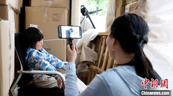 4月14日,越南商人阿柔(左二)邀請女兒出鏡,拍攝短視頻素材。金家明 攝