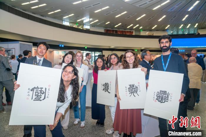當(dāng)?shù)貢r(shí)間4月14日,慶祝2025年聯(lián)合國中文日系列活動(dòng)在維也納聯(lián)合國總部開幕。圖為當(dāng)日來賓展示書法作品。(中國常駐維也納代表團(tuán)供圖)