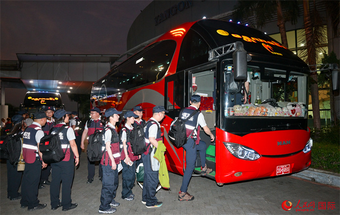 當?shù)貢r間4月19日晚,中國政府援緬衛(wèi)生防疫隊抵達仰光機場后轉(zhuǎn)乘大巴。人民網(wǎng)記者 謝佳君攝