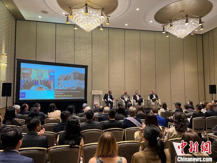 當(dāng)?shù)貢r(shí)間4月25日,美國前駐華大使駱家輝(講臺(tái)右一)出席美國華人精英組織百人會(huì)在洛杉磯舉行的2025年年會(huì)分論壇。 中新社記者 張朔 攝