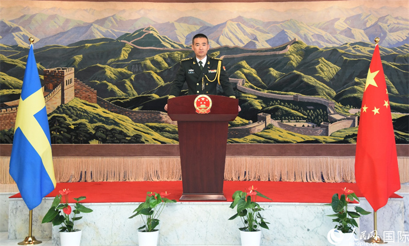 中國駐瑞典大使館新任國防武官袁林大校致辭。人民網(wǎng)記者 殷淼攝