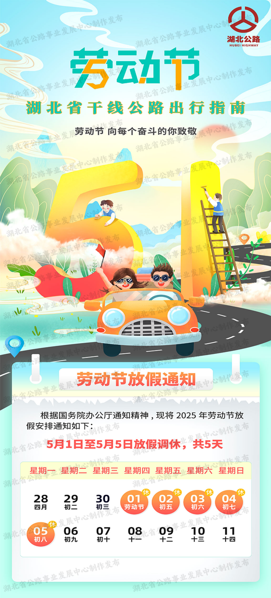 湖北省公路事業(yè)發(fā)展中心根據(jù)歷年來勞動(dòng)節(jié)假期全省公路網(wǎng)運(yùn)行監(jiān)測(cè)情況,提前分析研判2025年勞動(dòng)節(jié)假期路網(wǎng)運(yùn)行態(tài)勢(shì),預(yù)計(jì)勞動(dòng)節(jié)假期期間公路網(wǎng)流量較日常漲幅明顯,出行需求以踏青出游、探親訪友等中短途自駕出行為主,省內(nèi)各市州周邊路段和通往知名景區(qū)路段的交通流量大幅增長,武漢市及其他重點(diǎn)城市周邊路段易出現(xiàn)擁堵緩行?,F(xiàn)編制《2025年勞動(dòng)節(jié)假期湖北省干線公路出行指南》,為公眾平安便捷出行提供參考。