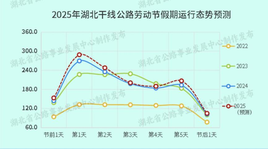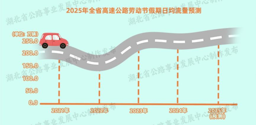 湖北省公路事業(yè)發(fā)展中心根據(jù)歷年路網(wǎng)運(yùn)行數(shù)據(jù)分析,結(jié)合假期全省路網(wǎng)天氣預(yù)測(cè)以及近期車流量等運(yùn)行實(shí)際,預(yù)計(jì)勞動(dòng)節(jié)假期期間高速路網(wǎng)通行車輛流量為近期平日日均流量的2.14倍,較2024年勞動(dòng)節(jié)假期日均流量同比增長約5%。