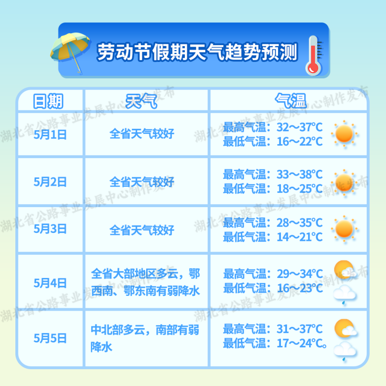 湖北省公路事業(yè)發(fā)展中心經(jīng)與省氣象服務(wù)中心會(huì)商研判,預(yù)計(jì)今年勞動(dòng)節(jié)小長假期間(5月1日—5日),我省前晴后雨,氣溫變化平穩(wěn),溫度適宜,天氣條件總體利于出行。其中,5月1日—3日全省天氣較好;4日大部地區(qū)多云,鄂西南、鄂東南有弱降水;5日中北部多云,南部有弱降水。