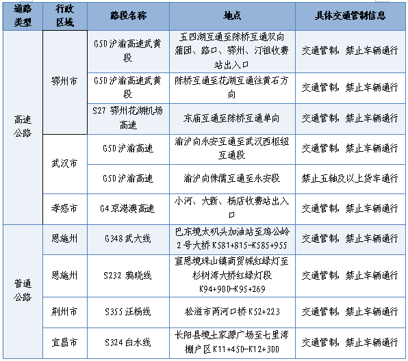 普通公路易緩行路段有:G242甘欽線恩施段、G348武大線宜昌夷陵段、S316 新土線十堰丹江口段、S312宜興線宜昌夷陵段、S108荷土線武漢黃陂段、S105蔡城線武漢蔡甸段、G347國道南德線孝感云夢(mèng)段、G318滬聶線武漢新洲段、G351臺(tái)小線恩施宣恩段、G346上安線孝感大悟段。
