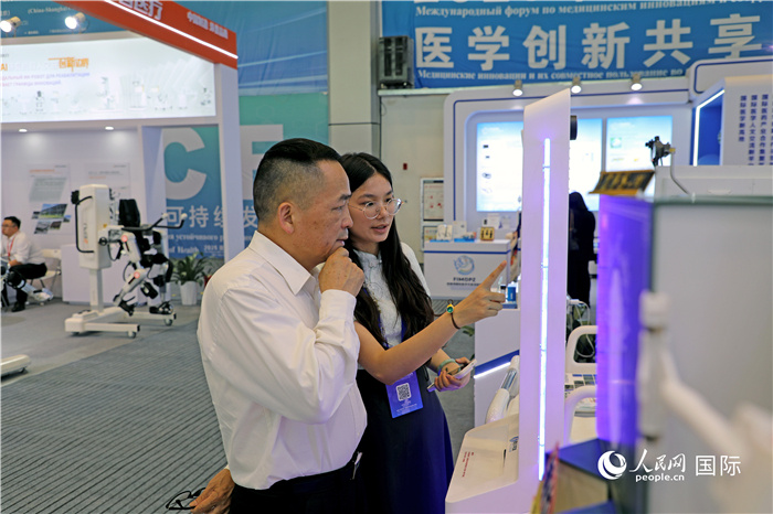 參觀者在國(guó)際醫(yī)學(xué)創(chuàng)新交流合作展上與機(jī)器人互動(dòng)。人民網(wǎng)記者 趙益普攝