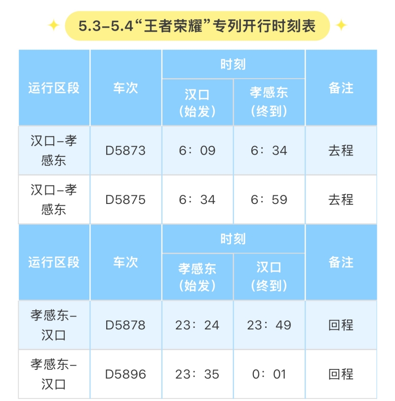 “王者榮耀專列”(5月3日和5月4日),每日安排四趟為您免費(fèi)服務(wù),在漢口站、孝感東站、孝感奧體中心專列服務(wù)臺(tái)領(lǐng)取“王者榮耀專列乘車證”直接進(jìn)出站乘車,數(shù)量有限,先到先得,送完為止!具體時(shí)刻表如下: