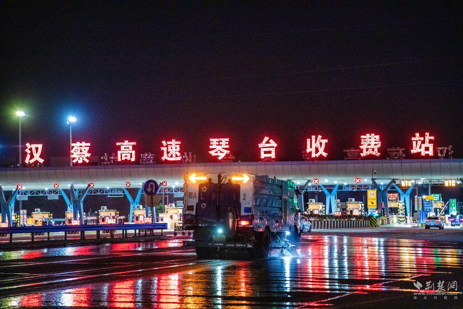 29日夜晚11時(shí)許,在漢陽漢蔡高速進(jìn)出城口,高壓清洗車、吸掃車、隔音屏清洗車等10余臺(tái)機(jī)械作業(yè)裝備待發(fā)。