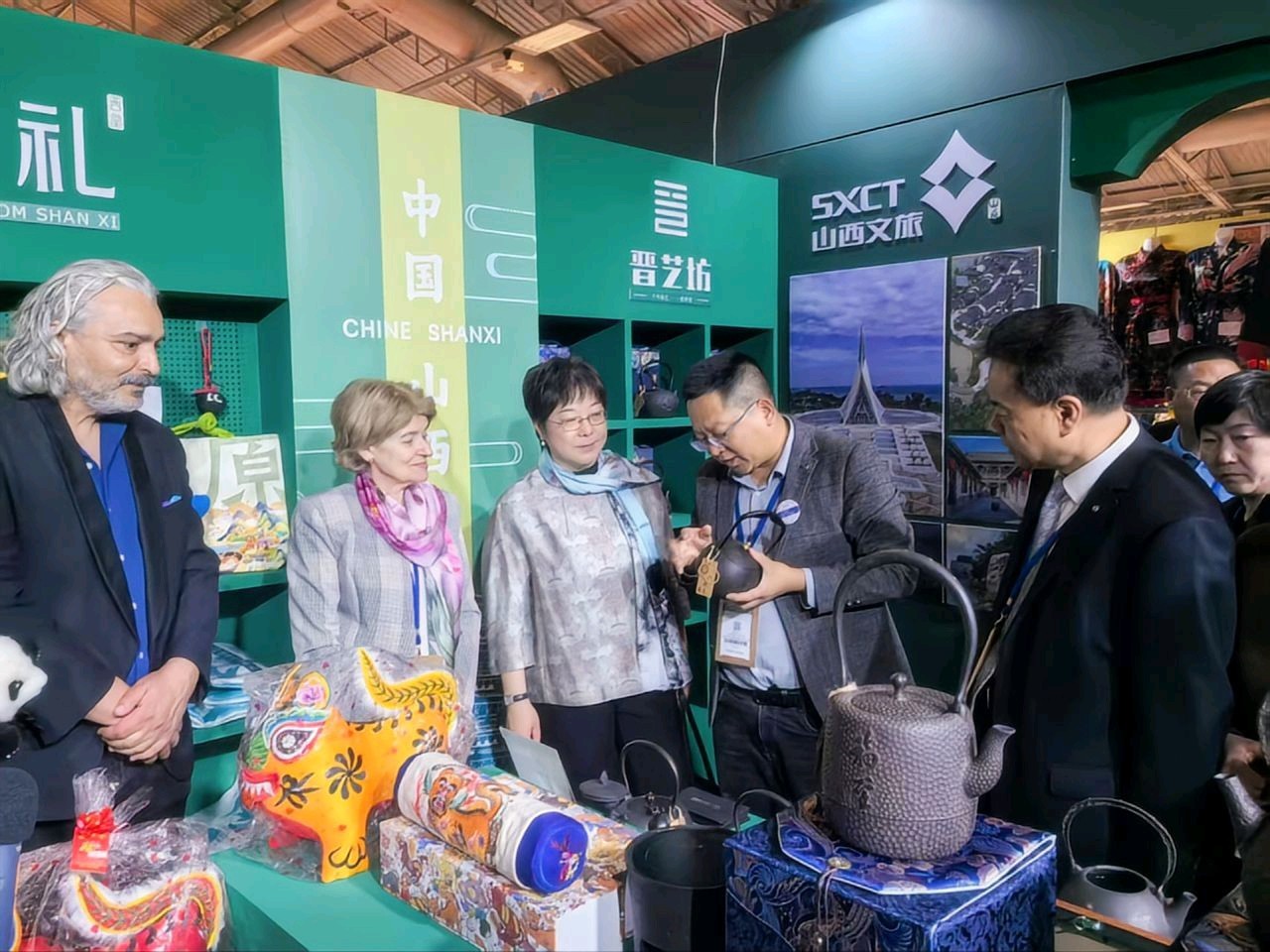 中國常駐聯(lián)合國教科文組織代表?xiàng)钚掠⒙?lián)合國教科文組織原總干事伊琳娜·博科娃到晉藝坊展位