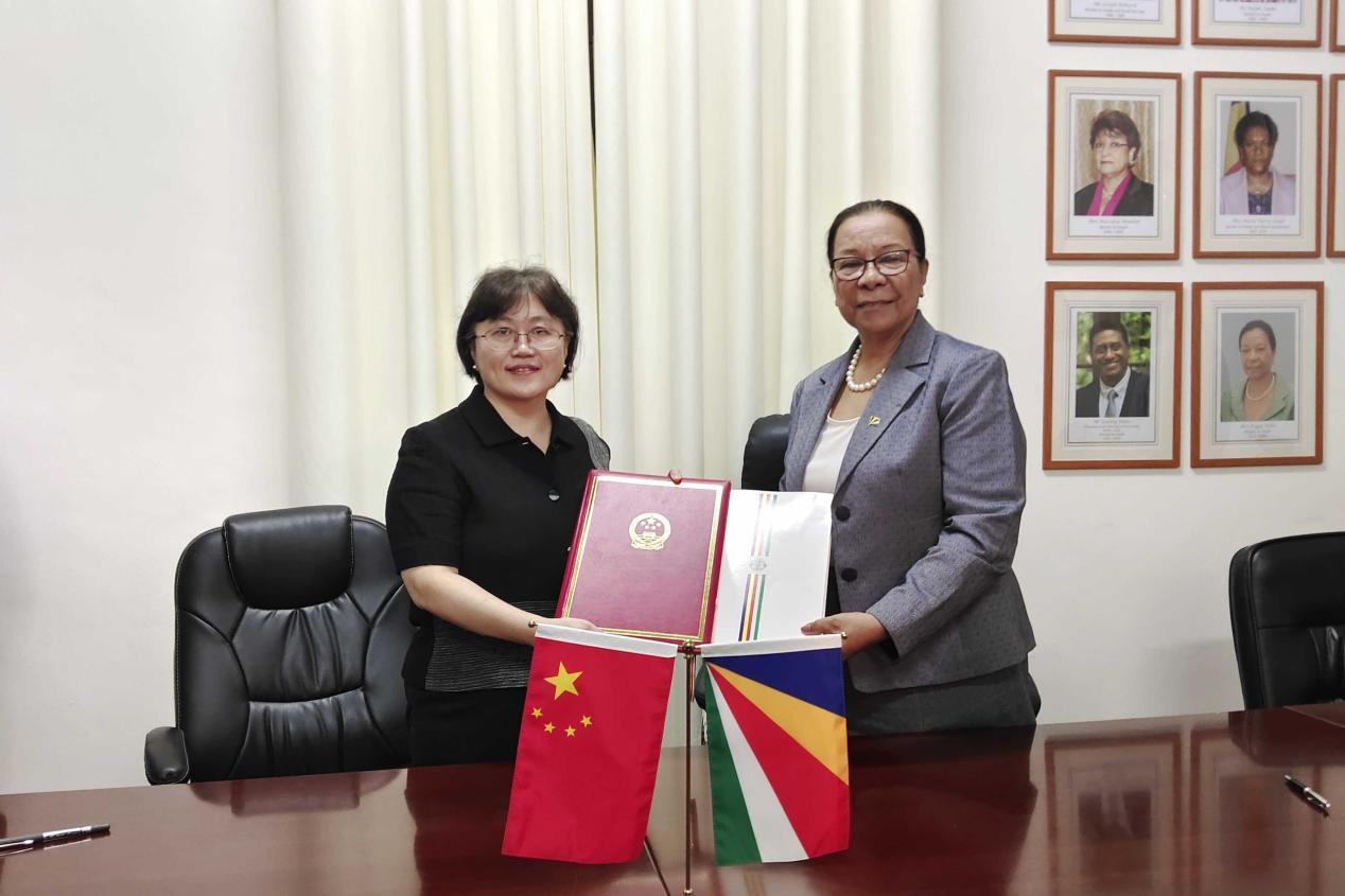中國駐塞舌爾大使林楠與塞舌爾衛(wèi)生部長維多分別代表兩國政府簽署中國援塞醫(yī)療隊議定書(2024-2028)。駐塞舌爾使館供圖