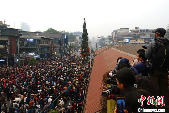 當(dāng)?shù)貢r(shí)間4月5日,尼泊爾加德滿都,尼泊爾迎來一年一度的戰(zhàn)車節(jié),民眾拉著32英尺(約9.75 米)高的神像戰(zhàn)車進(jìn)行巡游,吸引大批尼泊爾民眾及外國游客圍觀。中新社記者 崔楠 攝