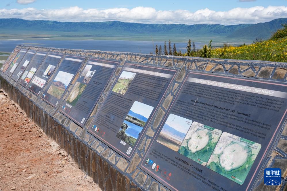 這是4月26日在坦桑尼亞阿魯沙恩戈羅恩戈羅-倫蓋地質(zhì)公園拍攝的中企修建的解說牌。新華社記者 李亞輝 攝