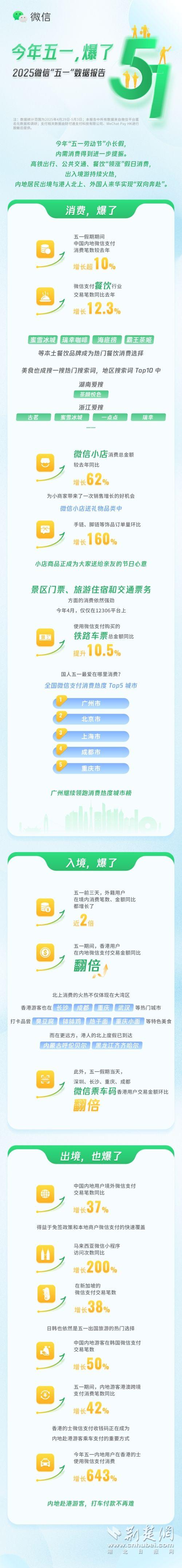 荊楚網(湖北日報網)訊(通訊員 袁軒 )今年勞動節(jié)假期首次增加一天,內需消費得到進一步提振。5月5日,微信團隊發(fā)布的2025五一數據報告顯示,假期微信支付交易筆數增長超10%,高鐵出行、公共交通、餐飲“領漲”假日消費,除成都、重慶、杭州外,東莞、蘇州、佛山等城市進入全國消費熱度Top 10。