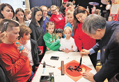 2月,俄羅斯中小學(xué)師生在莫斯科觀看中國書法展示。
