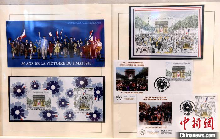 當(dāng)?shù)貢r間5月7日,法國發(fā)行紀(jì)念二戰(zhàn)勝利80周年郵票。圖為蘭斯中央郵局展示的郵票圖稿和首日封。中新社記者 李洋 攝