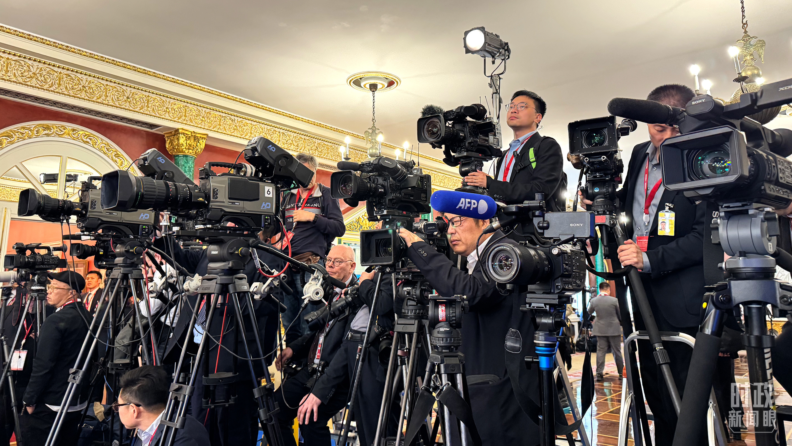△等待中俄兩國(guó)元首共見記者的中外媒體同仁。(總臺(tái)央視記者陸泓宇、蔣碩拍攝)