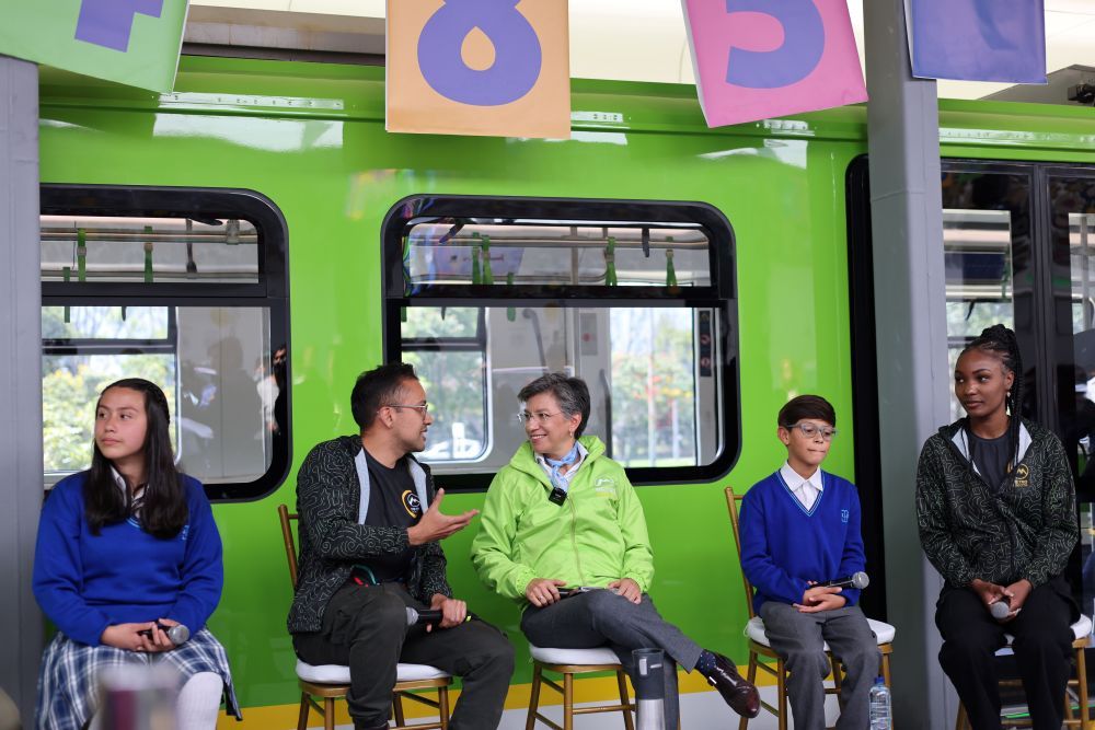 2023年8月10日,哥倫比亞波哥大市長克勞迪婭·洛佩斯(中)在波哥大地鐵的模型車廂旁跟參加活動的師生交流。按照計劃,由中企承建和運營的波哥大地鐵一號線將在2028年正式投入運營。新華社記者 周盛平 攝