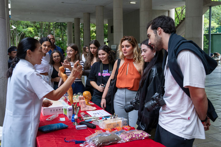 2025年4月15日,在巴西里約熱內(nèi)盧天主教大學舉辦的“國際中文日”慶祝活動上,學生們觀看中醫(yī)療法展示。新華社記者 王天聰 攝