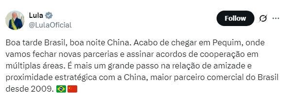 中新網(wǎng)5月14日電 巴西總統(tǒng)盧拉于5月10日至14日對中國進行國事訪問。抵達中國后,盧拉的社交媒體賬號連發(fā)多條帖文。