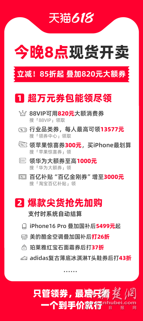 荊楚網(wǎng)(湖北日?qǐng)?bào)網(wǎng))訊(通訊員 朱飛)晚8點(diǎn),天貓618現(xiàn)貨開(kāi)賣(mài)!