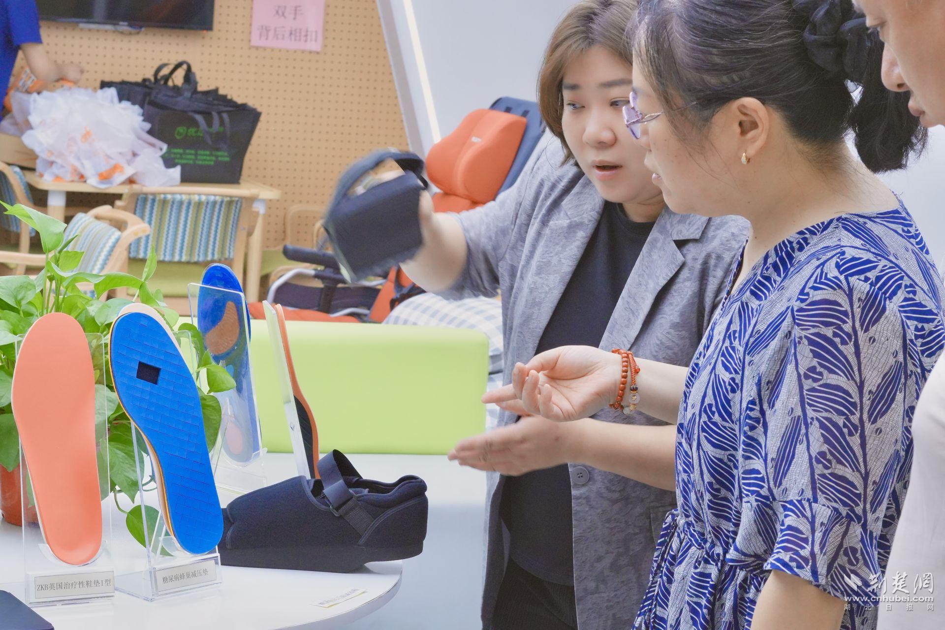 一側(cè)展區(qū)則擺放著各類康復(fù)輔具,吸引了不少居民駐足體驗(yàn)。防跟裂襪、減壓鞋墊、艾草健康鞋、足底按摩球……這些看似日常小物,實(shí)則是糖尿病足管理中不可或缺的“隱形衛(wèi)士”。