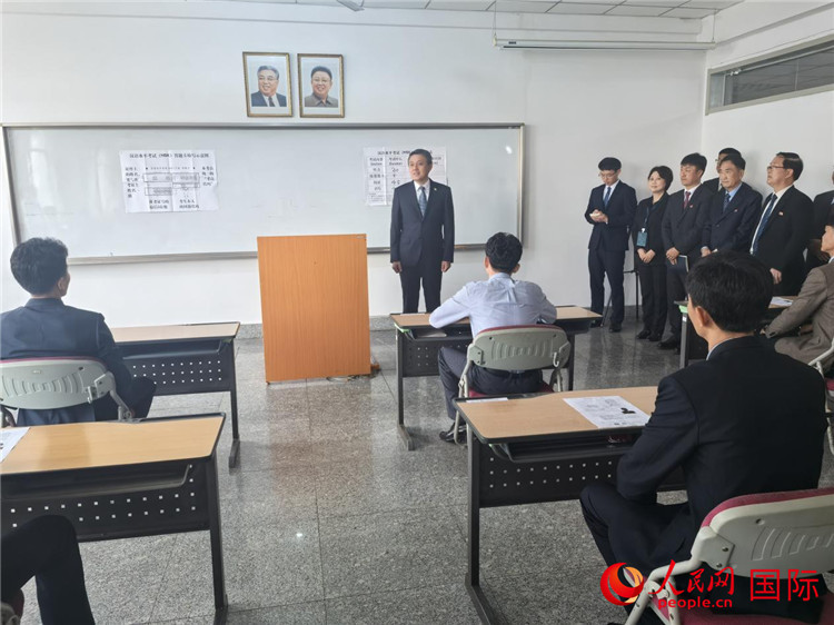 當?shù)貢r間5月17日,王亞軍大使率中國駐朝鮮使館部分外交官赴平壤科技大學參訪。圖為王大使一行出席HSK啟動儀式,同考生們互動交流。人民網(wǎng)記者 劉融攝