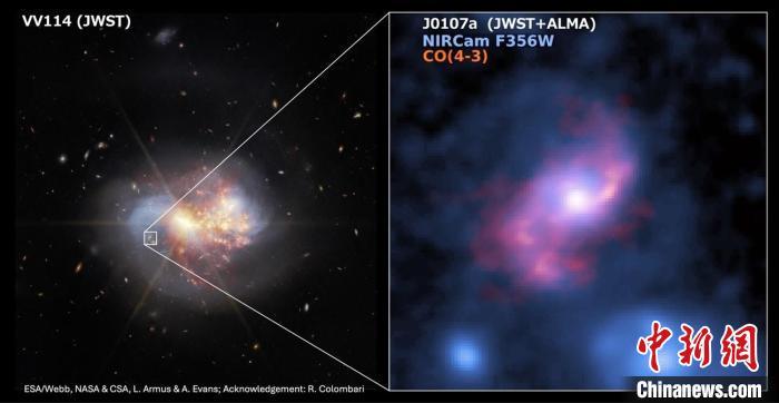 NASA韋布望遠鏡拍攝的近紅外圖像,顯示了附近星系VV114和背景中的巨型棒旋星系J0107a;右圖為J0107a的恒星和分子氣體分布(圖片來自論文)。施普林格·自然 供圖