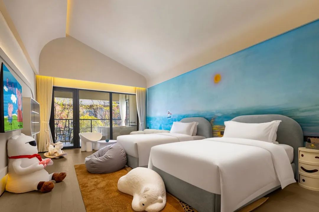 29間主題客房承包全家歡笑,從蘑菇王國到兔子先生,從綠野仙蹤到夢樂島,每一扇門后都藏著無盡的驚喜與想象。客房均精心打造專屬童趣壁畫,仿佛住進絢爛多彩的童話世界。