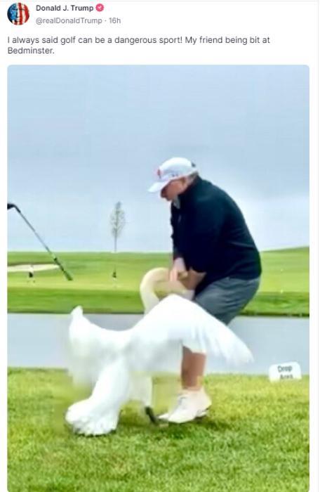 據(jù)報道,特朗普寫道,“我一直說高爾夫是一項危險的運動!我的朋友在貝德明斯特被咬了”。