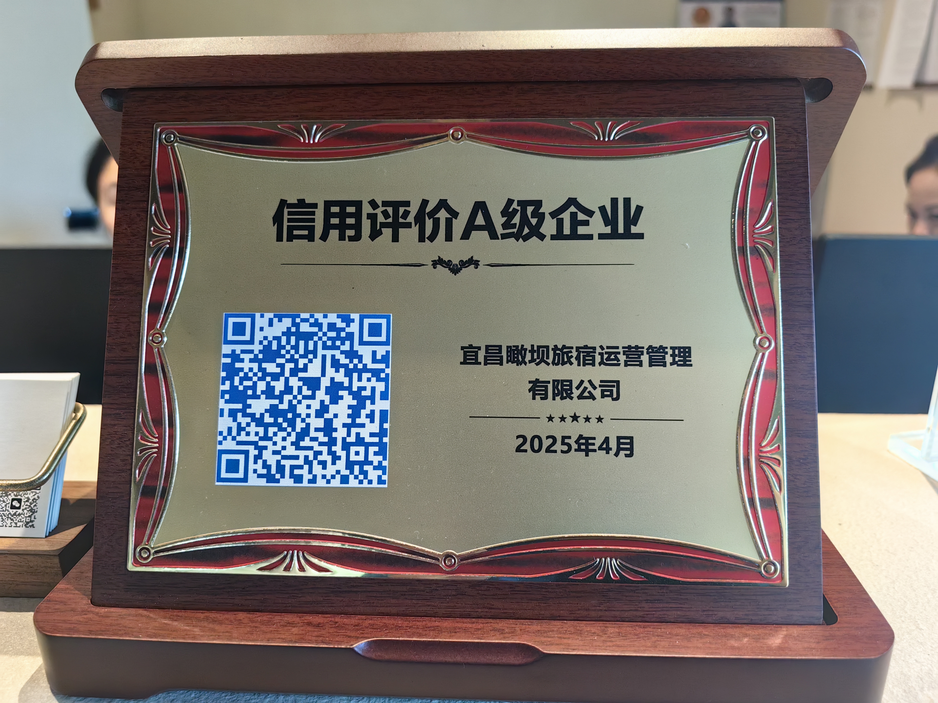 九間房民宿前臺的信用評價(jià)A級企業(yè)木牌