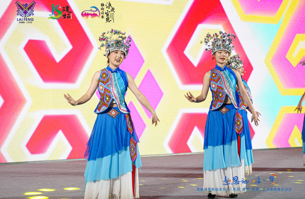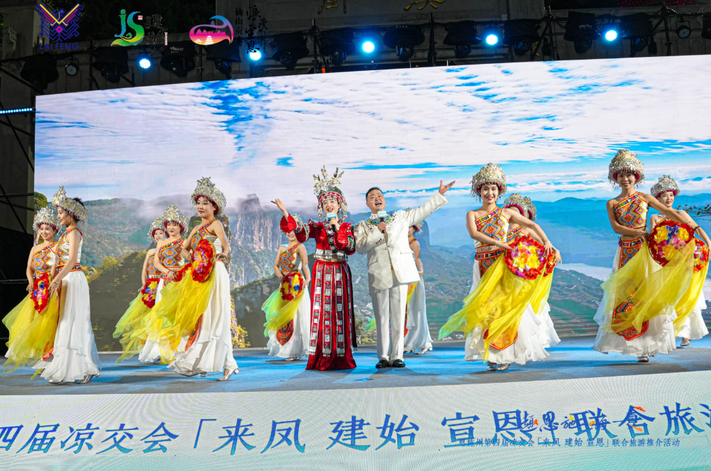 宣恩縣以“浪漫”為關(guān)鍵詞,串聯(lián)仙山貢水旅游區(qū)的璀璨夜景、彭家寨古吊腳樓的土家文化體驗、獅子關(guān)水上浮橋的山水美景,以及矅天眼寒武紀(jì)地質(zhì)奇觀。推介官通過茶香四溢的伍家臺貢茶文化、野椒園侗族大歌、宣恩耍耍等非遺活動,展現(xiàn)“中國民間文化藝術(shù)之鄉(xiāng)”的獨特魅力。歌伴舞《施南謠》與苗族舞蹈《哩嘞響》則用藝術(shù)語描繪了宣恩的溫情與浪漫。