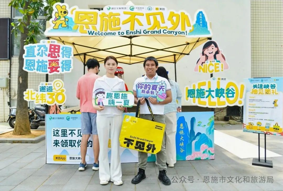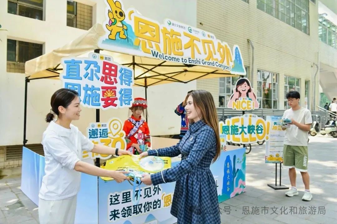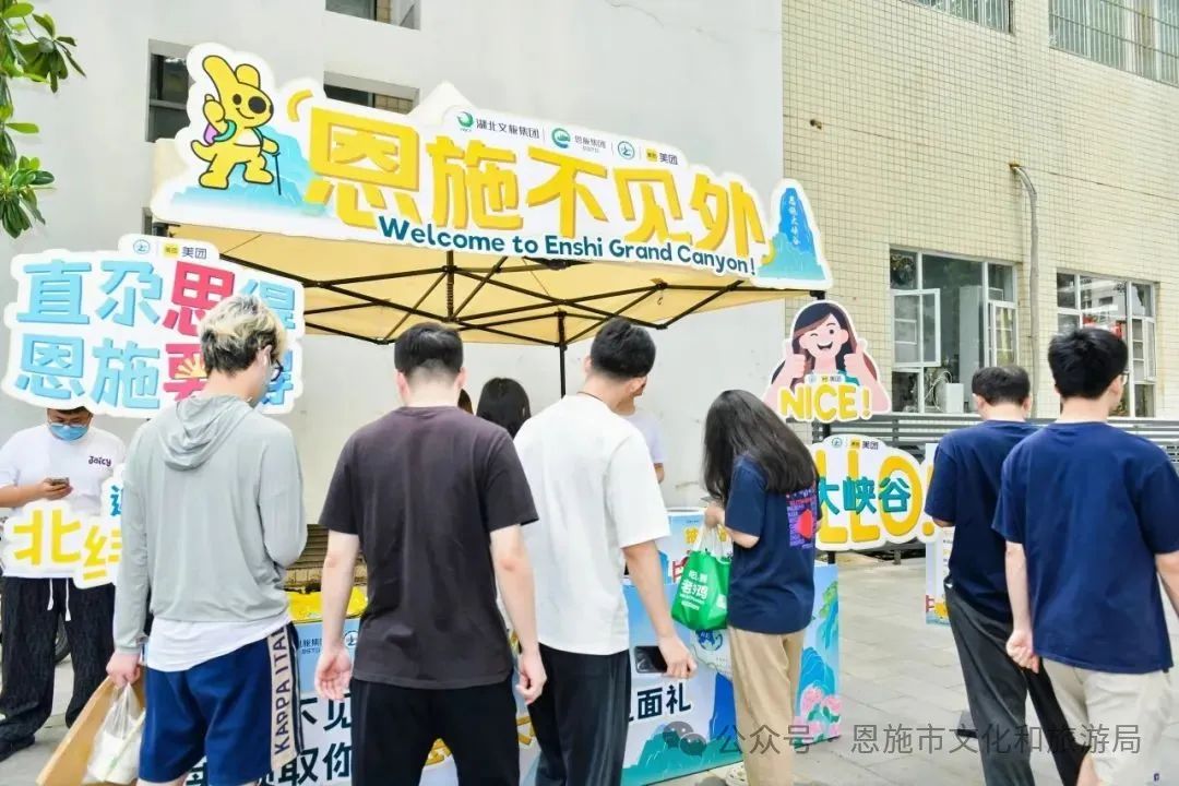 活動(dòng)現(xiàn)場,熱情洋溢的恩施土家族幺哥幺妹手持手舉牌,積極引導(dǎo)互動(dòng),吸引了眾多學(xué)子駐足體驗(yàn)。學(xué)子們通過景區(qū)官方社媒打卡抽獎(jiǎng)互動(dòng),以恩施大峽谷為窗口,深入了解并走近恩施的自然風(fēng)光和土家風(fēng)情。此外,現(xiàn)場派發(fā)的景區(qū)免費(fèi)門票、顯眼編織包、聯(lián)名透扇等“峽谷見面禮”,也迅速點(diǎn)燃了學(xué)子們的參與熱情,讓整個(gè)活動(dòng)現(xiàn)場充滿了青春活力與歡樂氛圍。