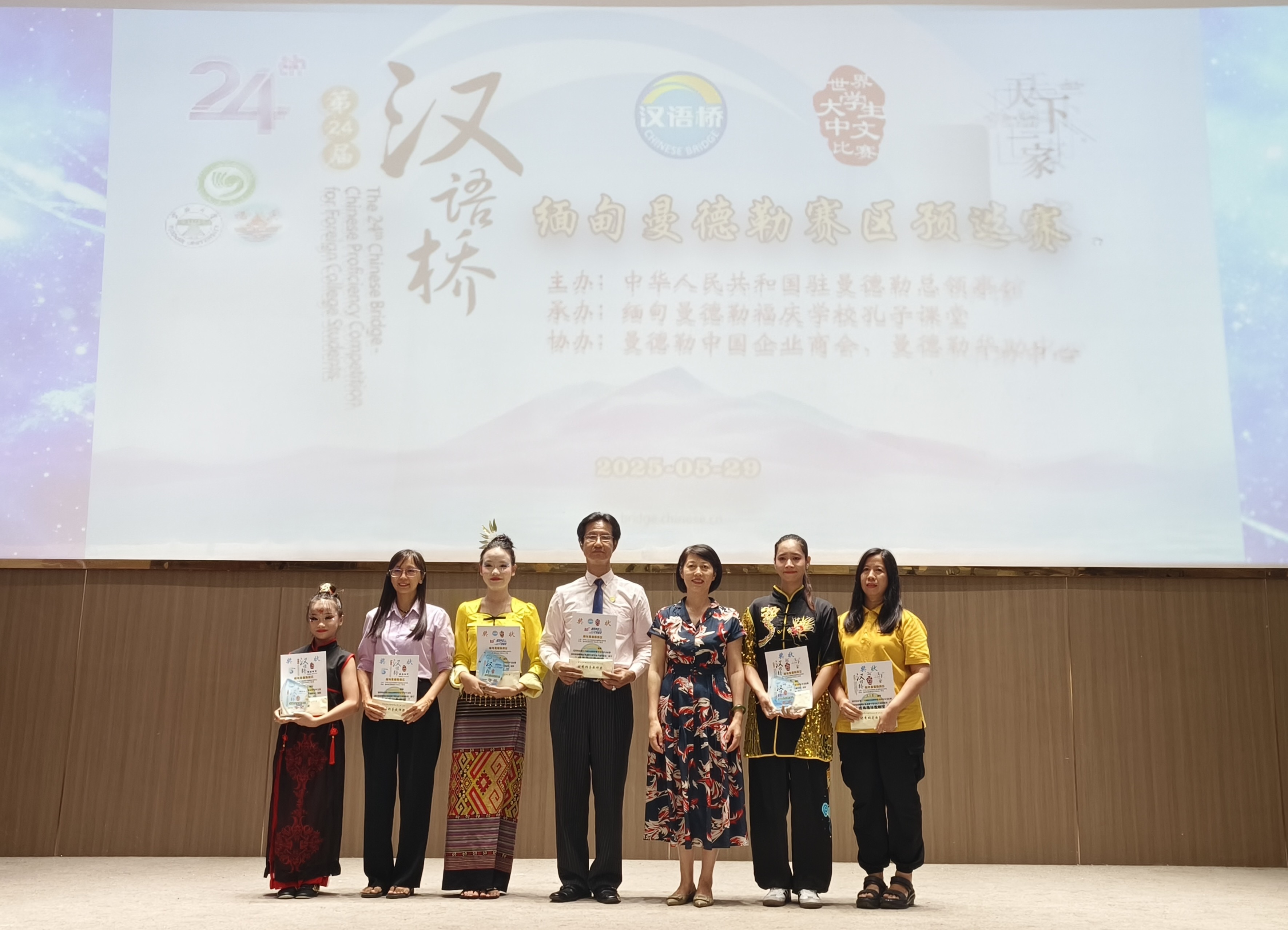 中國(guó)駐曼德勒總領(lǐng)事高萍為2025年“漢語(yǔ)橋”中文比賽緬甸曼德勒賽區(qū)優(yōu)勝選手頒獎(jiǎng)。中國(guó)駐曼德勒總領(lǐng)事館供圖