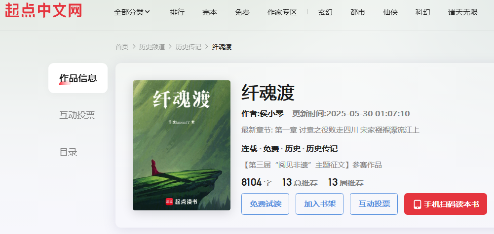 目前,讀者下載“起點讀書”APP或者進入起點中文網(wǎng)搜索書名《纖魂渡》就可以閱讀,作者將保持每天3000——5000字左右的更新,讀者的留言和建議都將被采納到后續(xù)小說內(nèi)容里,此書是“閱見非遺”長篇小說征文作品,作者表示特別期待家鄉(xiāng)讀者與作家一起頭腦風(fēng)暴,體驗歷史之重,非遺之美,文學(xué)之蘊。
