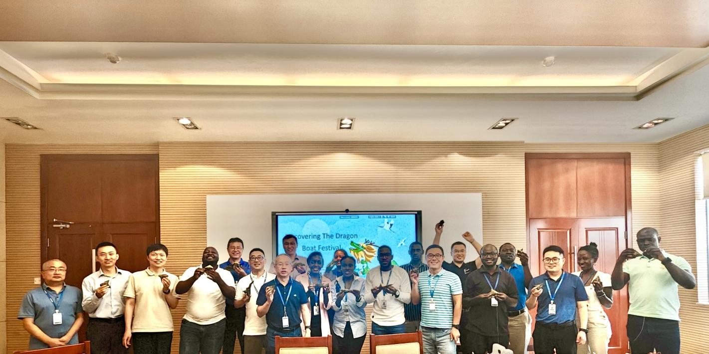 在“Lunch & Learn” 端午節(jié)文化課堂上,中方員工王帥向中烏同事介紹了端午節(jié)由來(lái)、傳統(tǒng)習(xí)俗、當(dāng)代傳承,讓本地雇員切身感受到中華古老文化的獨(dú)特魅力。過(guò)端午,必然少不了吃粽子這個(gè)“重頭戲”。當(dāng)清香的粽葉香氣在活動(dòng)現(xiàn)場(chǎng)彌漫開(kāi)來(lái),一個(gè)個(gè)裹著翡翠外衣的粽子整齊排列,瞬間牢牢抓住了本地員工們好奇的目光。一位烏干達(dá)員工興奮地說(shuō)道:“這是我第一次吃粽子!它獨(dú)特的制作方法和可愛(ài)的形狀太有意思了,味道也棒極!”